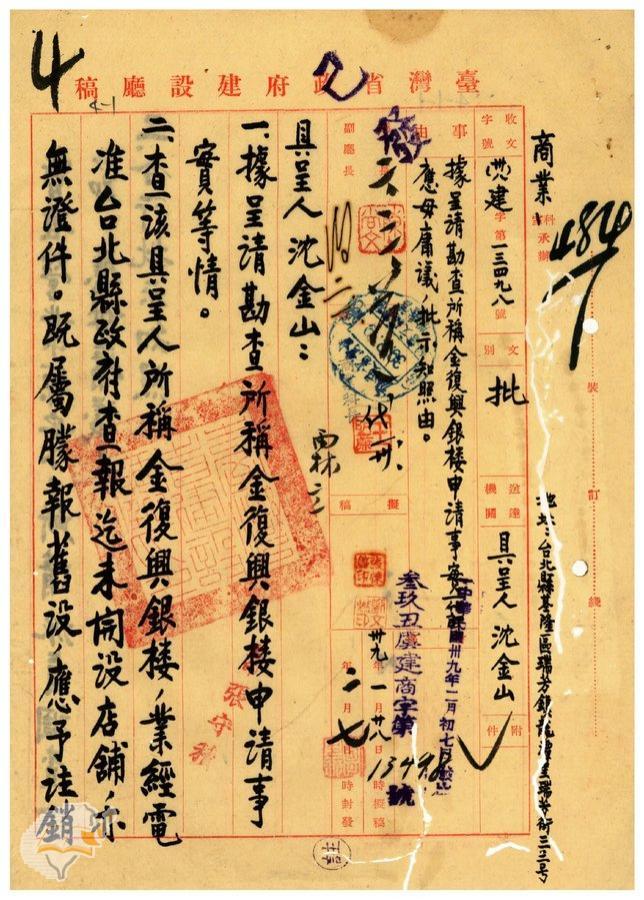 台灣省政府建設廳(1950-02-07)。[案由:據沈金山呈請勘查所稱金復興銀樓申請事實一節應毋庸議批示知照由]。《數位典藏與數位學習聯合目錄》。http://catalog.digitalarchives.tw/item/00/42/22/70.html(2025/01/03瀏覽)。