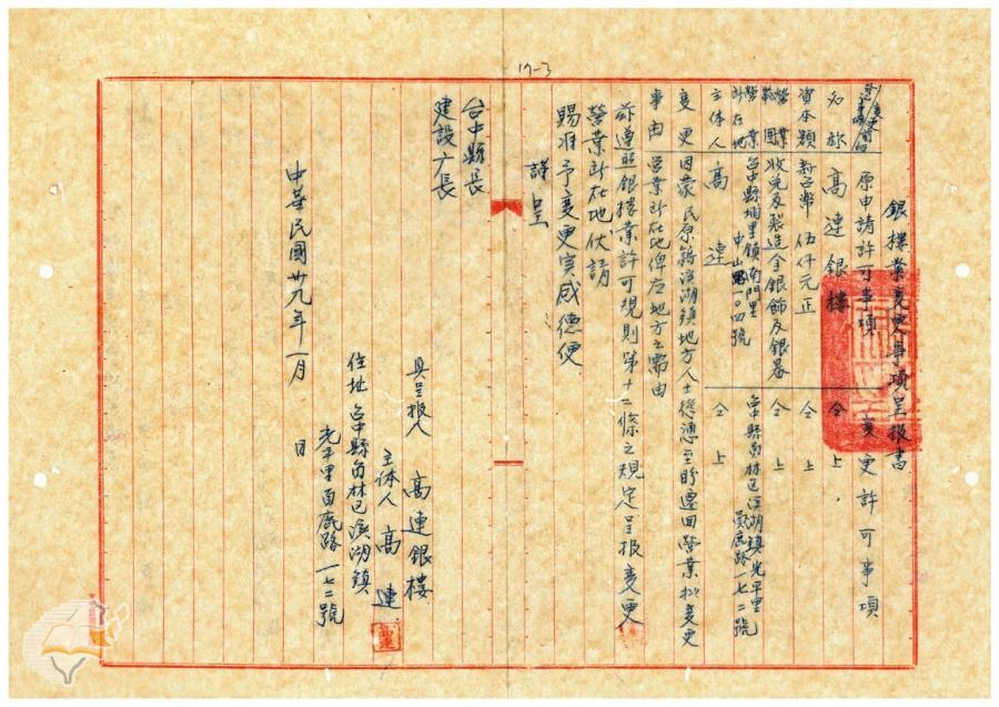 案由:電復高連所請變更高連銀樓營業所在地一案應准備查希查照由