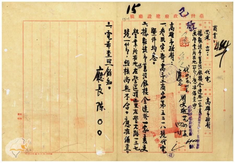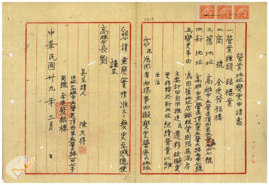 台灣省政府建設廳(1950-04-22)。[案由:據報高雄市舊設銀樓金連發一家變更營業所在地一節應准備查由]。《數位典藏與數位學習聯合目錄》。http://catalog.digitalarchives.tw/item/00/42/22/a7.html(2025/01/03瀏覽)。
