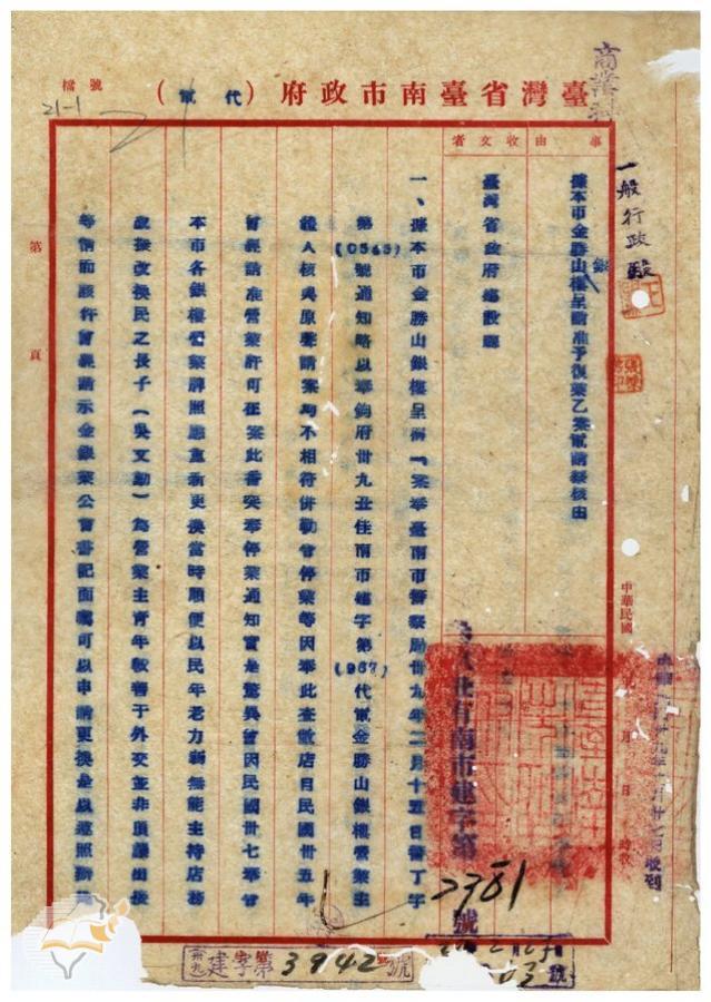 台南市政府(1950-02-27)。[案由:據台南市金勝山銀樓呈請准予復業乙案電請察核由]。《數位典藏與數位學習聯合目錄》。http://catalog.digitalarchives.tw/item/00/42/22/ad.html(2025/01/03瀏覽)。