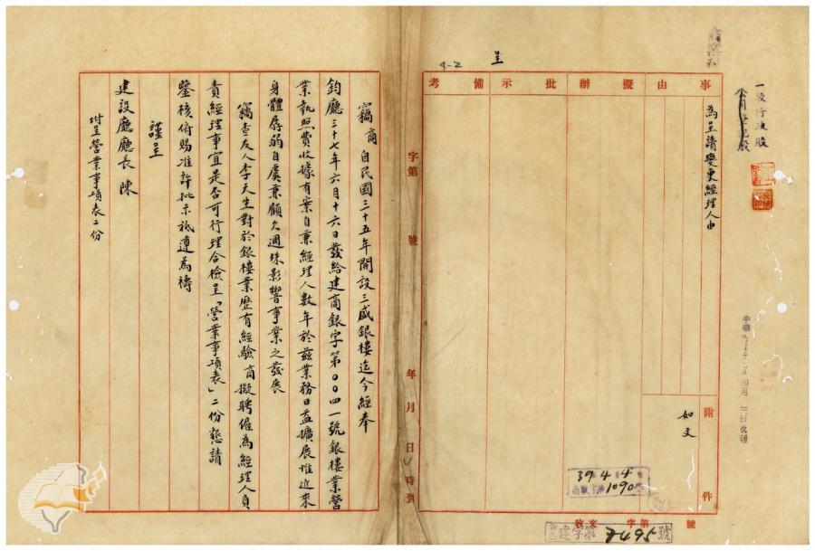 案由:據三盛銀樓劉傳壽呈請變更經理人一節准予備查由