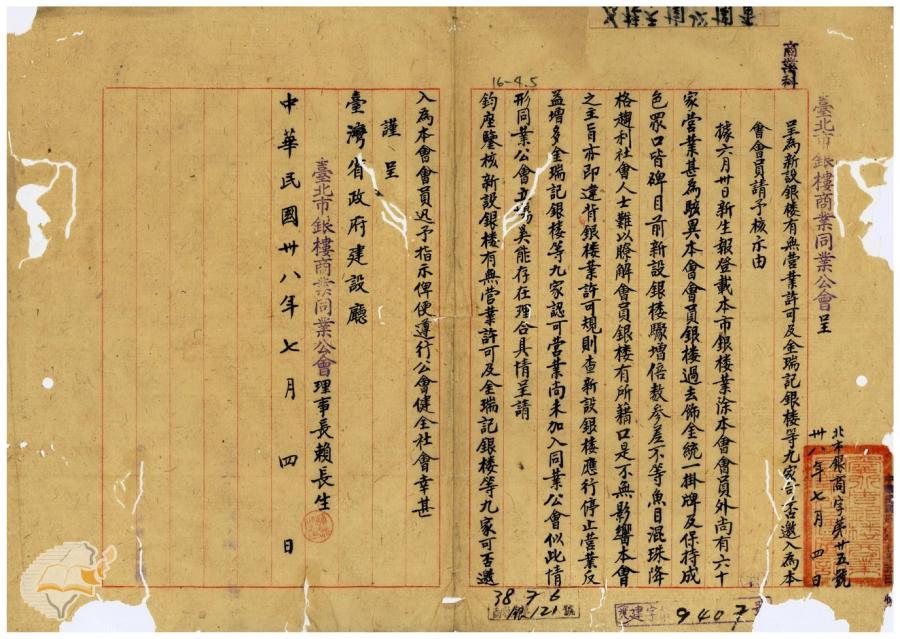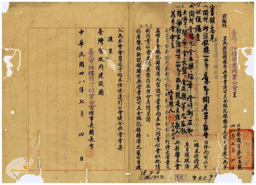 台灣省政府建設廳(1950-03-28)。[案由:據台北市銀樓商業同業公會理事長賴長生呈為新設銀樓有無營業許可及金瑞記等九家銀樓可否邀入為台北市銀樓商業同業公會會員等情批示知照由]。《數位典藏與數位學習聯合目錄》。http://catalog.digitalarchives.tw/item/00/42/22/c0.html(2025/01/03瀏覽)。