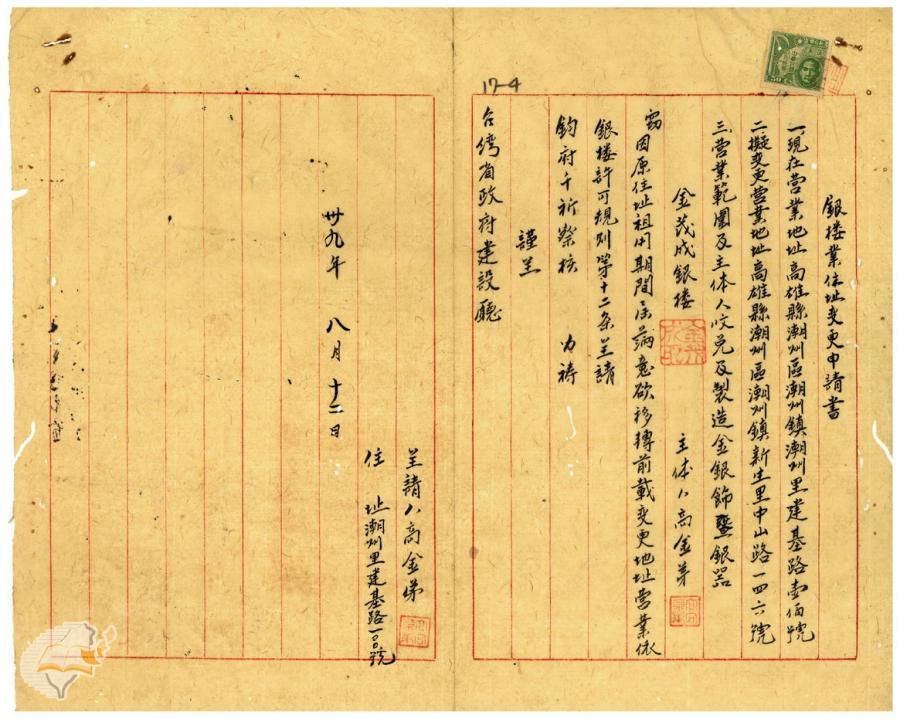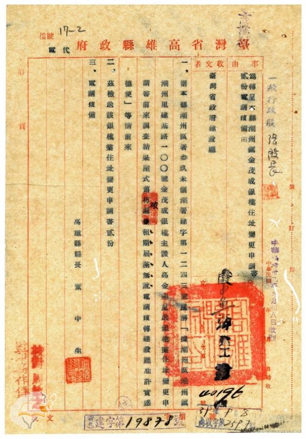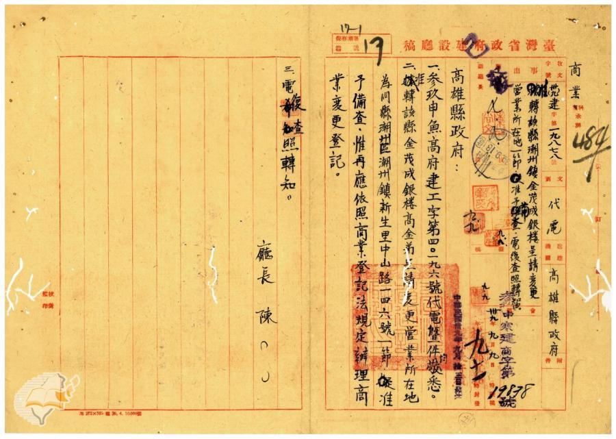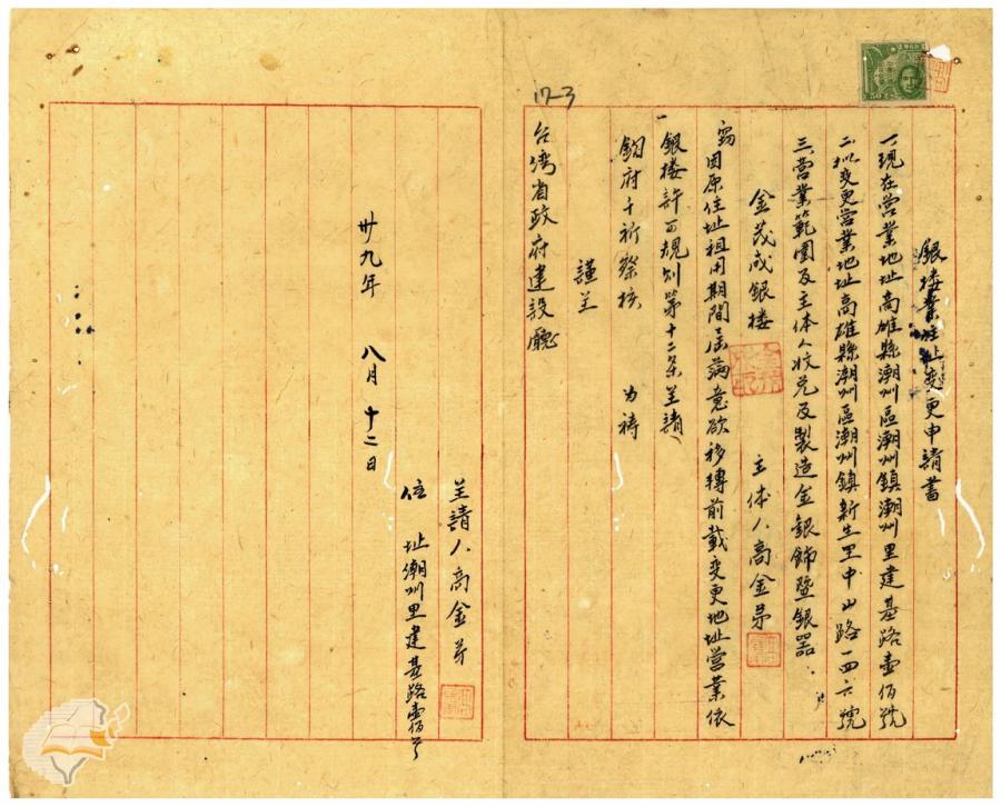 台灣省政府建設廳(1950-09-13)。[案由:准轉該縣潮州鎮金茂成銀樓呈請變更營業所在地准予備查由電復查照轉知由]。《數位典藏與數位學習聯合目錄》。http://catalog.digitalarchives.tw/item/00/42/23/5c.html(2025/01/03瀏覽)。