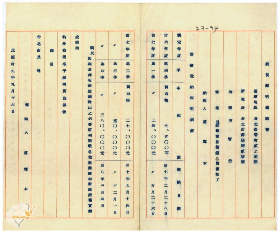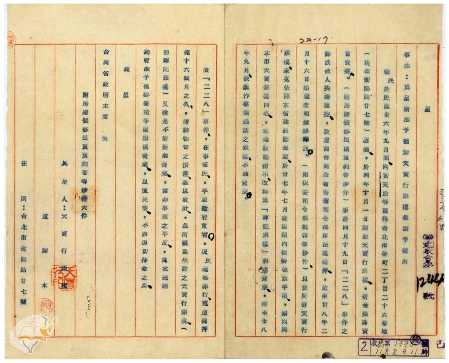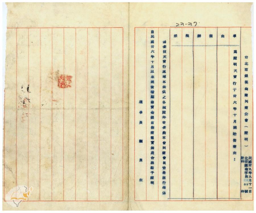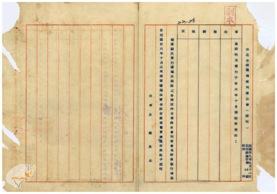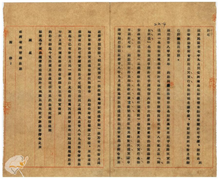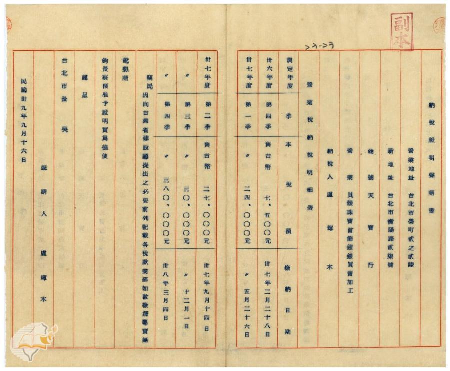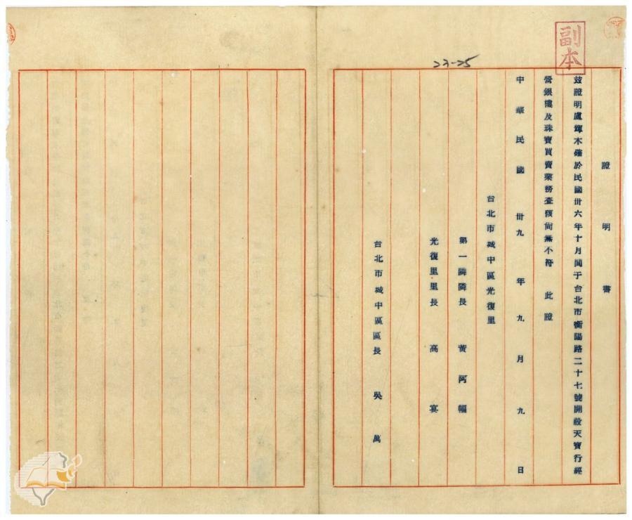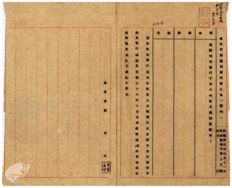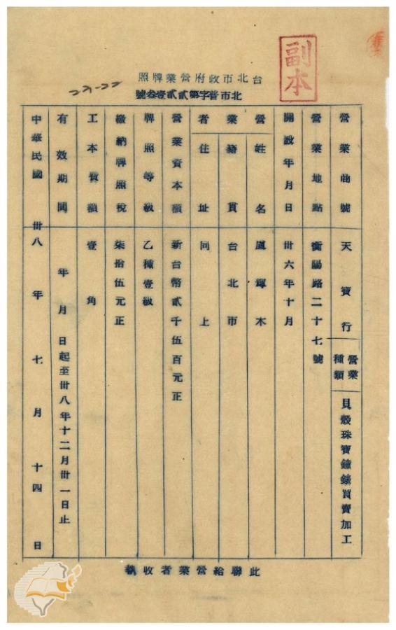 天寶行銀樓盧輝木(1950-09-12)。[案由:呈為陳明銀行許可經過情形懇請迅予核准繼續營業並發給執照由]。《數位典藏與數位學習聯合目錄》。http://catalog.digitalarchives.tw/item/00/42/23/d4.html(2025/01/03瀏覽)。