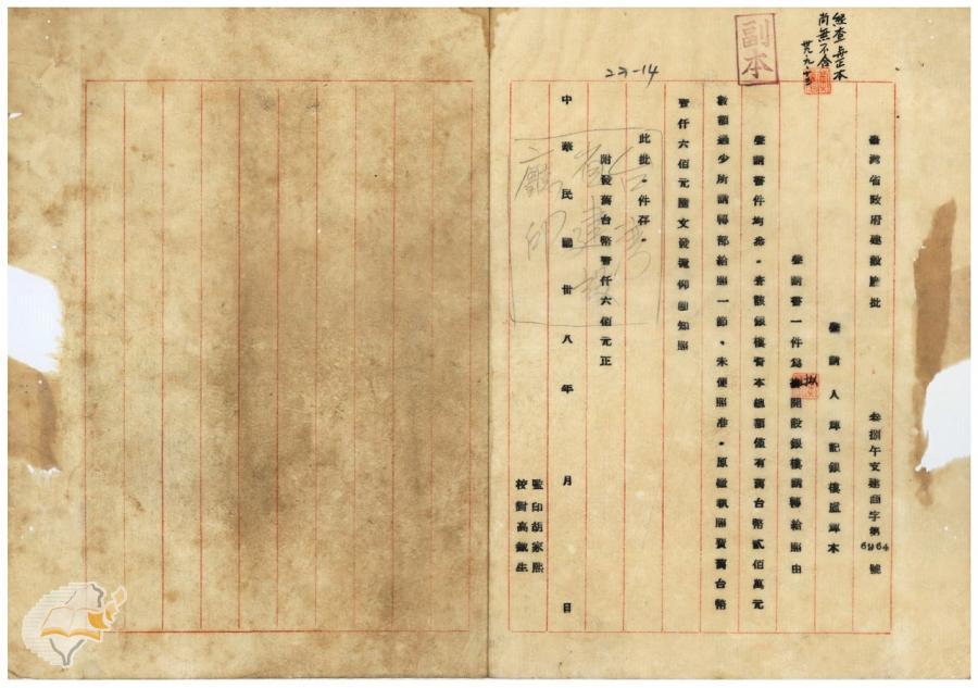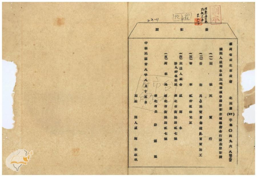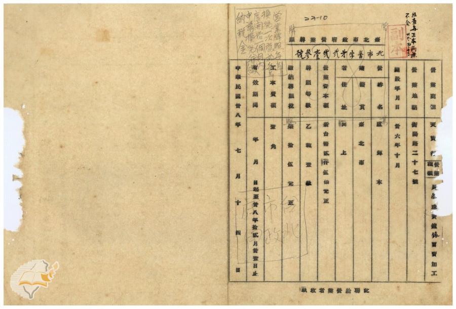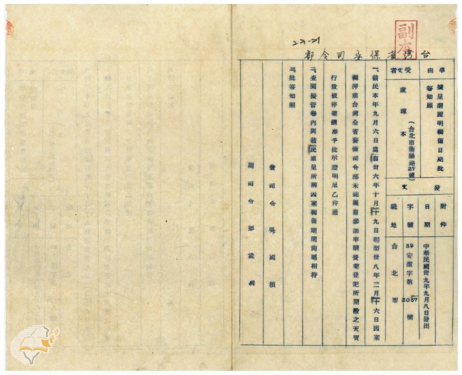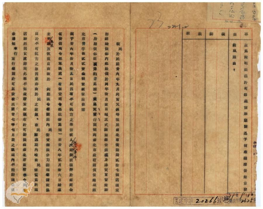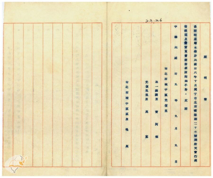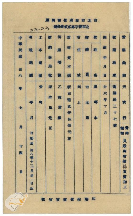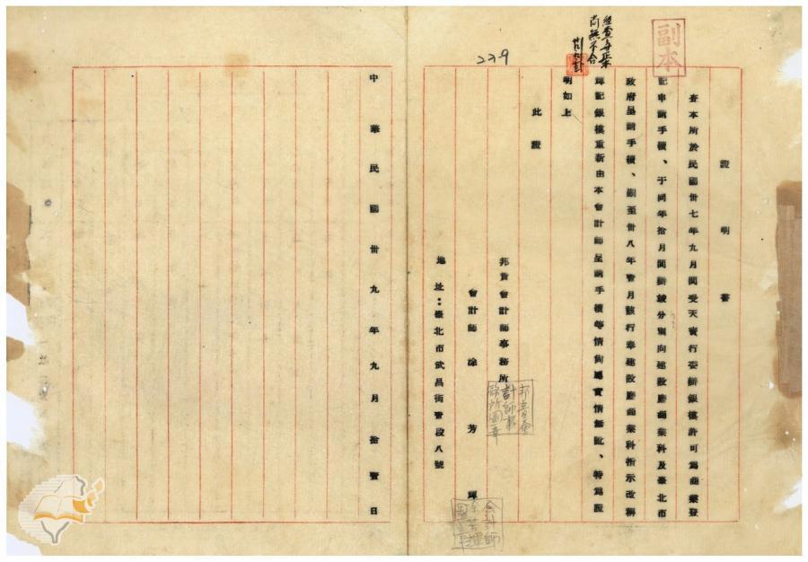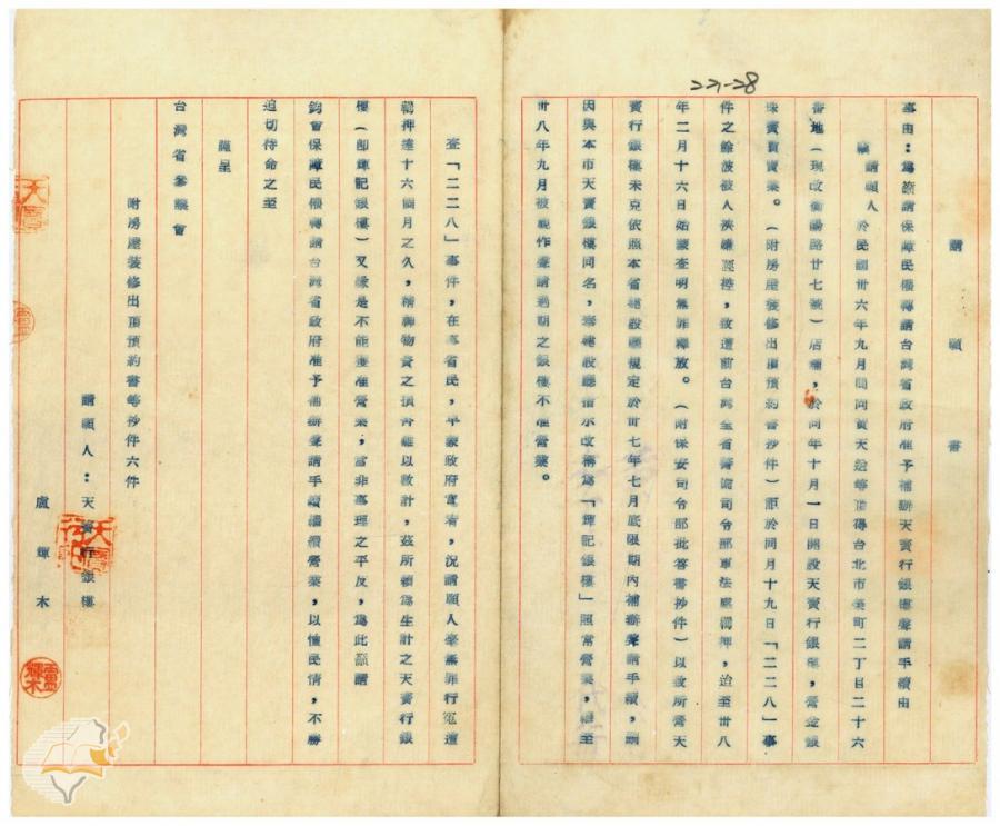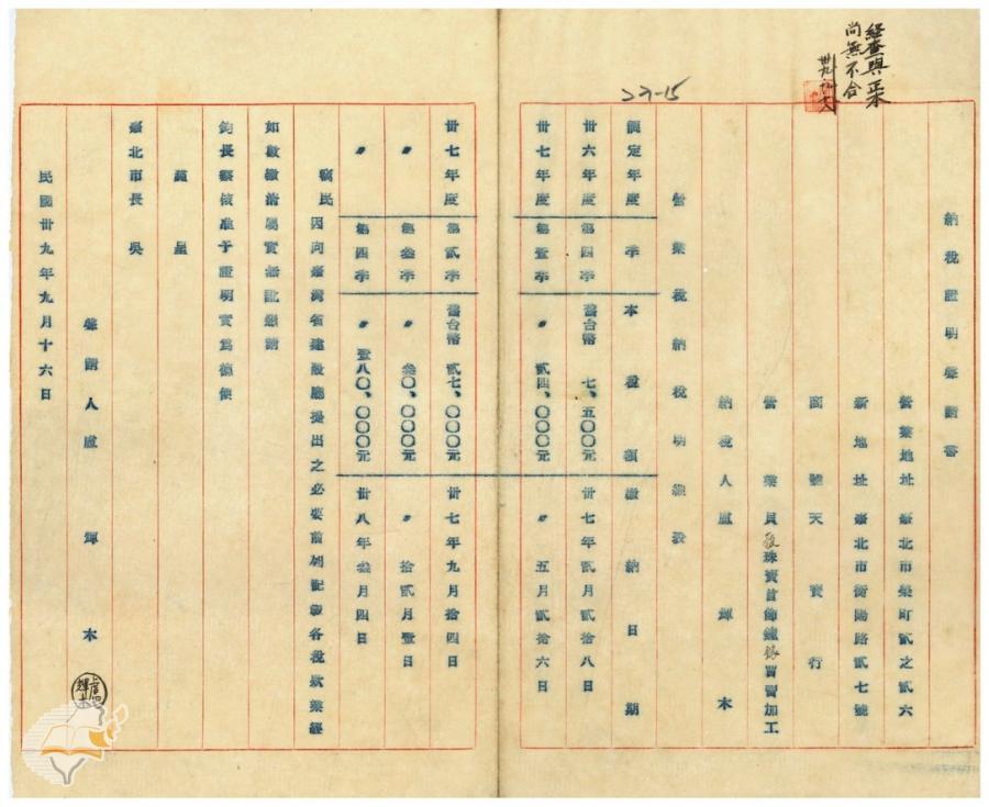天寶行銀樓盧輝木(1950-09-12)。[案由:呈為陳明銀行許可經過情形懇請迅予核准繼續營業並發給執照由]。《數位典藏與數位學習聯合目錄》。http://catalog.digitalarchives.tw/item/00/42/23/d4.html(2025/01/03瀏覽)。