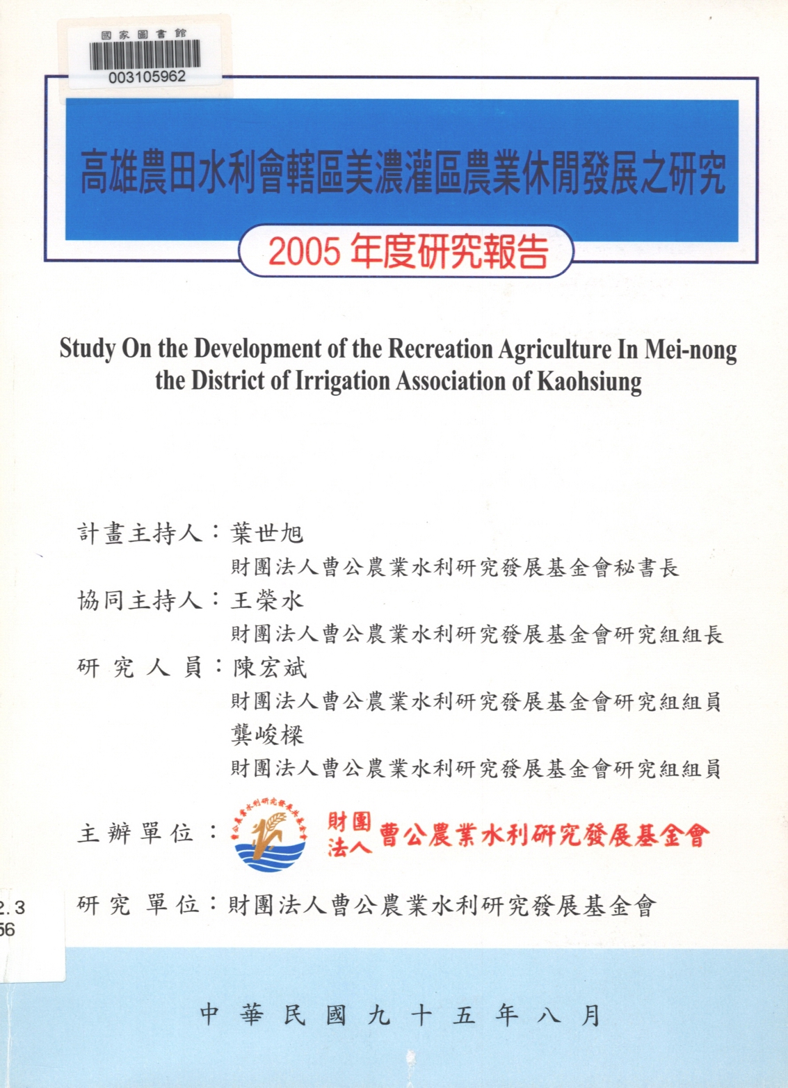 研究主持(2006-08)。[「高雄農田水利會轄區美濃灌區農業發展之研究」初期報告審查意見對照表]。《數位典藏與數位學習聯合目錄》。http://catalog.digitalarchives.tw/item/00/5d/45/36.html(2025/01/18瀏覽)。