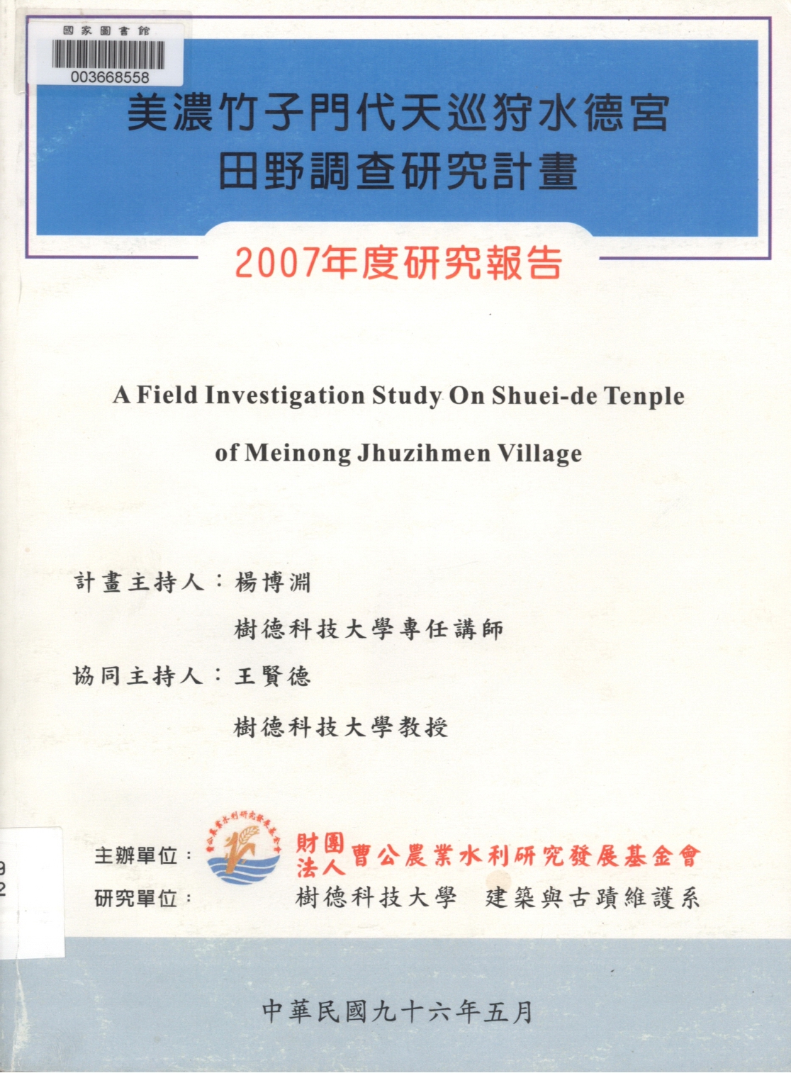 計畫主持(2007-05)。[圖5-2.5 民國84年代天水德宮正立面圖]。《數位典藏與數位學習聯合目錄》。http://catalog.digitalarchives.tw/item/00/5d/4c/cb.html(2025/01/18瀏覽)。