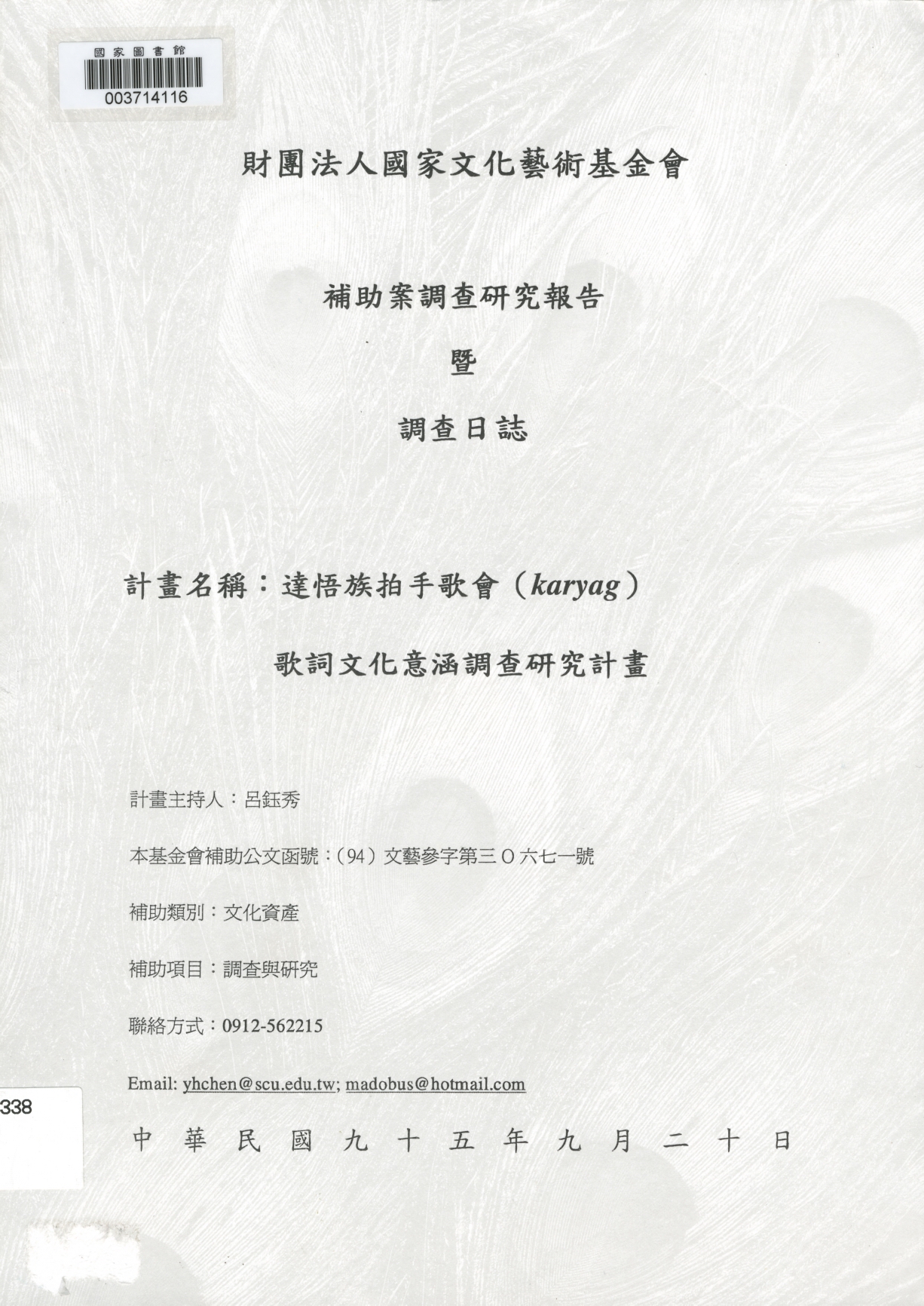 計畫主持(2006-09)。[7.口傳形式的歌詞記憶]。《數位典藏與數位學習聯合目錄》。http://catalog.digitalarchives.tw/item/00/5d/96/b3.html(2025/01/18瀏覽)。