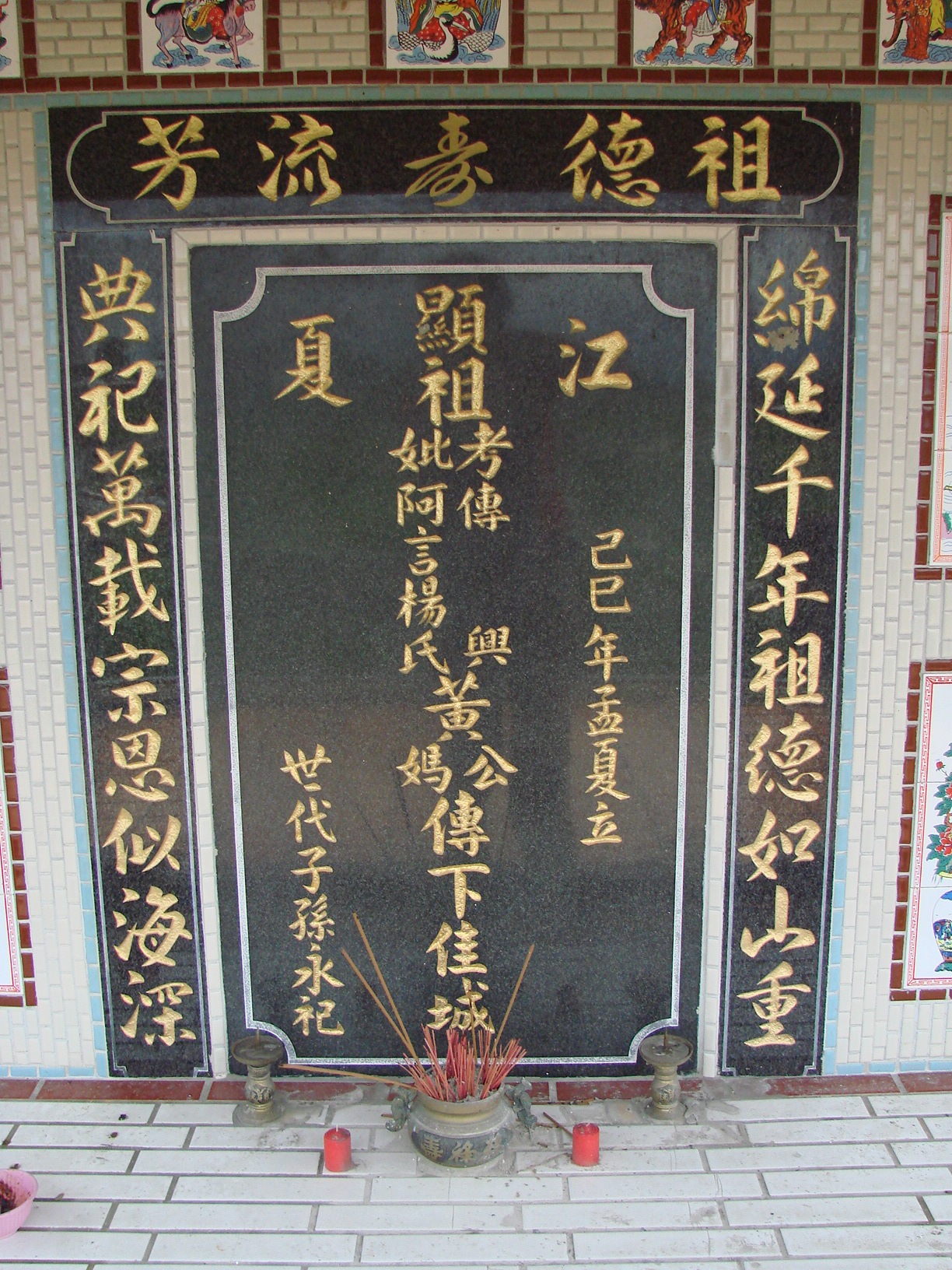 The tomb is located in Taiwan, Taidongxian, Guanshanzhen, Guanshan. The characters of this tombstone are carved, and they are gold, . The tombstone is rectangular. , The elements on this tombstone are (person)(location)(date)(erected by). The symmetric top-part of the tombstone is the focus. The focused element here is (location). ; 這是一個在台灣,台東縣,關山鎮,關山發現的墳墓。這個墓碑上的文字都是直接鑿刻上去的, 而後塗上金色。這個墓碑的形狀是四邊形。這個墓碑上所紀載的訊息包括「人」、「地域」、「日期」、「立」。墓碑上方左右對稱的部份是訊息的「焦點」。這個墓碑的焦點是「地域」。