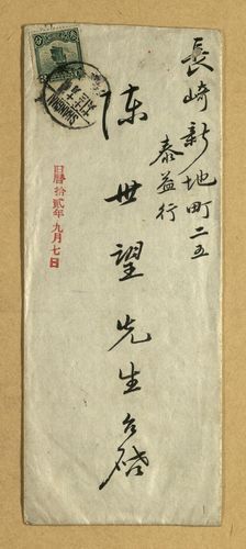範圍與內容:本件收錄書信2封,發信時間為1923年10月至1923年10月,發信人陳兆禎、簡炳壃,發信地址為寶山路寶山里44號。書信內容提及縐紗、毛織類貨物等商品的交易情形。1923年10月13日書信中提及日本因震災免除毛織類貨物關稅,應指1923年關東大地震。1923年10月24日書信附有簡炳壃名片1張。