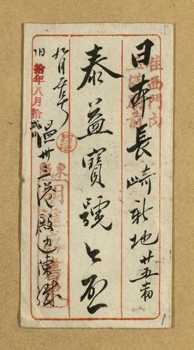 範圍與內容:本件收錄書信1封,發信時間為1921年9月,發信人陳壽卿、陳來如、陳瓊琳,發信地址為浙江溫州西門內三港殿邊。書信內容為陳壽卿、陳來如、陳瓊琳三人至浙江當地差旅,並回報當地血青、檀香等商品行情。信封有「東甌胡進盛書柬」印記。