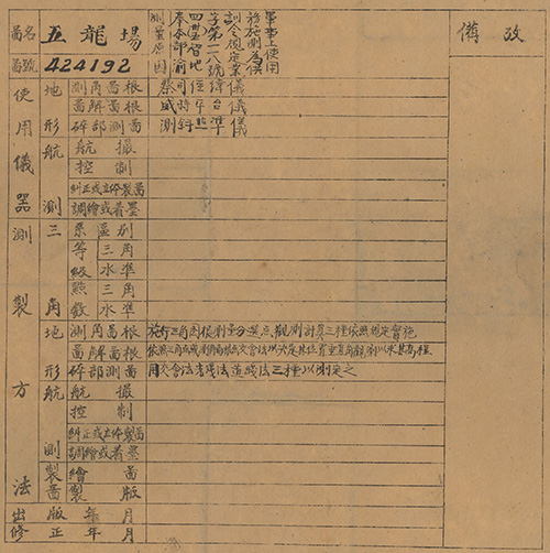 陸地測量總局各測量隊(年代不詳)。[地圖名稱:五龍場圖歷表424192]。《數位典藏與數位學習聯合目錄》。http://catalog.digitalarchives.tw/item/00/81/24/d7.html(2020/07/07瀏覽)。