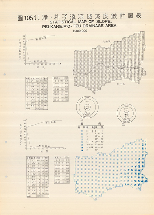 臺灣師範大學發行 聯勤測量署印(年代不詳)。[地圖名稱:圖105. 北港、朴子溪流域坡度統計圖表]。《數位典藏與數位學習聯合目錄》。http://catalog.digitalarchives.tw/item/00/81/52/10.html(2020/07/07瀏覽)。