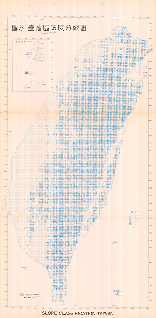 臺灣師範大學發行 聯勤測量署印(年代不詳)。[地圖名稱:圖5. 臺灣區坡度分級圖]。《數位典藏與數位學習聯合目錄》。http://catalog.digitalarchives.tw/item/00/81/52/53.html(2020/07/07瀏覽)。