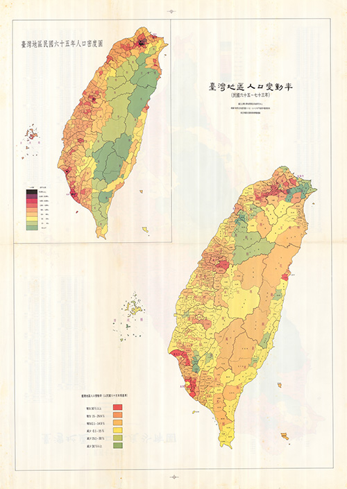行政院農委會主辦 航測及遙感探測學會編(年代不詳)。[地圖名稱:臺灣地區人口變動率、民國六十五年人口密度圖]。《數位典藏與數位學習聯合目錄》。http://catalog.digitalarchives.tw/item/00/81/52/62.html(2020/07/07瀏覽)。