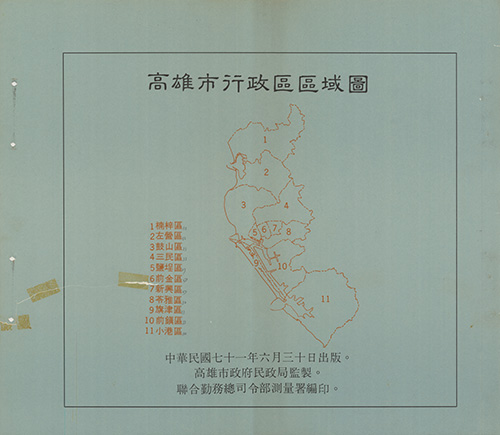 高雄市政府民政局監製聯勤測量署編印(年代不詳)。[地圖名稱:封面]。《數位典藏與數位學習聯合目錄》。http://catalog.digitalarchives.tw/item/00/81/5a/5d.html(2020/07/07瀏覽)。