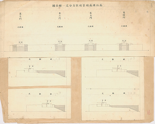 *(年代不詳)。[地圖名稱:南石唐北第四五六七門砲台砲位百分之一斷面圖]。《數位典藏與數位學習聯合目錄》。http://catalog.digitalarchives.tw/item/00/81/62/e9.html(2020/07/07瀏覽)。