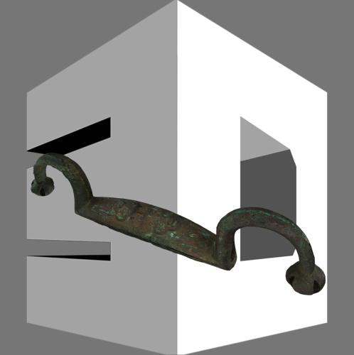 文物說明:本器中段略呈弧形,兩側為圓柱體弧臂,臂兩端為四瓣球鈴。弓形器的用途有多種說法,本件以石璋如、唐蘭的「弣飾」說最有說服力,作為弓的附件,保護弓不受損壞的「弣飾」說與「弓柲」說;另有作為御者控制馬轡的工具的「掛疆鉤」說與「弭」說;以及注重兩側鈴鐺功能的「旂鈴」說與「馬衡和鈴」說等推測其功能的假說。