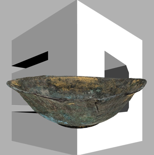 文物說明:出土於十三行遺址C區48號墓。弧腹,口部略外侈帶有圈足,口緣有一周穿孔,通體鎏金。內側刻有牡丹紋飾。外側及底部隱約可見轆轤痕跡,器表鏽蝕及砂土膠結嚴重。
