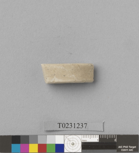形制:灰白色泥質陶環,外側平、內側圓弧,斷面呈半圓形。僅存殘件,表面風化。