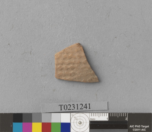 形制:紅褐色夾砂陶腹片,外側拍印波浪狀條紋,表面風化。屬鐵器時代十三行文化舊社類型的遺物。