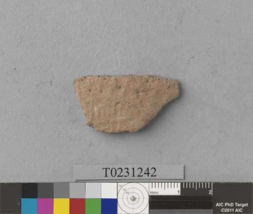 形制:褐色夾砂陶腹片,外側拍印紋飾,表面風化嚴重,無法判讀。屬鐵器時代十三行文化舊社類型的遺物。