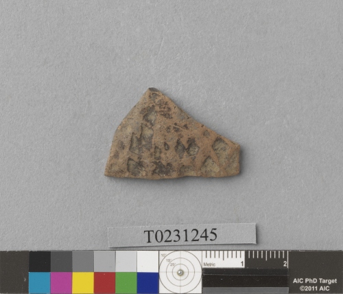形制:深褐色夾砂陶腹片,燒成溫度偏高,外側拍印方格紋,表面風化。屬鐵器時代十三行文化舊社類型的遺物。