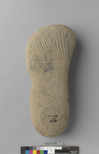 形制:有槽石棒,由砂岩卵石製成,兩側腰部經修整、較窄,雙面平整,上部較寬,刻有多道斜向刻痕,斜向刻痕底端有一道橫向刻痕。