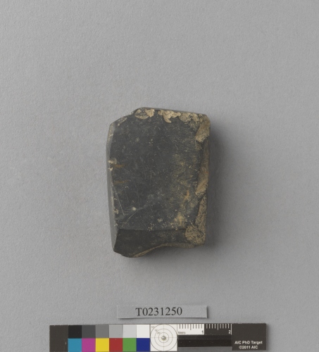 形制:錛,黑色,由硬頁岩打製後修磨而成,周緣經修整,近長方形,頂部平、一側有一斜角,體部四面修磨平整,刃部正面修磨出斜面,雙面修整近平。刃部局部殘失。