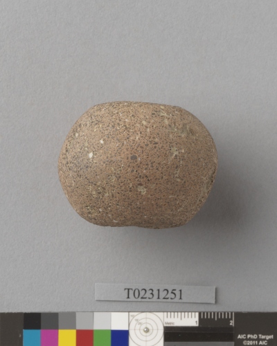形制:褐色夾砂陶紡輪,圓球狀,剖面呈橢圓形,兩端平,中央穿孔。素面無紋,表面風化。屬鐵器時代十三行文化舊社類型的遺物。