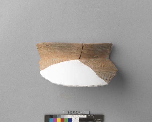 形制:褐色夾砂陶罐口緣,侈口、無唇、束頸、圓肩,燒成溫度偏高。口緣外側劃有橫條紋,肩部至腹部交錯拍印曲折紋及橫條紋。表面風化,由2片殘片拼合而成。屬鐵器時代十三行文化舊社類型的遺物。