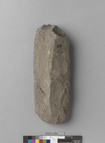 形制:石斧,灰色,由砂岩打製而成,周緣經修整,近長橢圓形,正面圓鼓、中央修整出一稜線,背面修整近平,兩端圓弧,刃部有消耗痕。