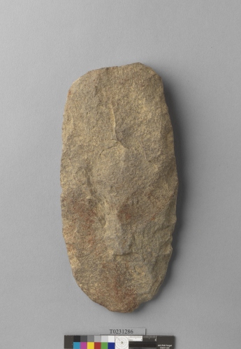 形制:斧鋤形器,褐色,由砂岩打製而成,周緣經修整,近橢圓形,上端較厚、下端較薄,正面修整近平。刃部有消耗痕。