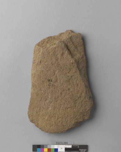 形制:斧鋤形器,土褐色,由砂岩打製而成,周緣經修整,近方形,雙面修整近平,頂部平,刃部圓弧、有消耗痕。