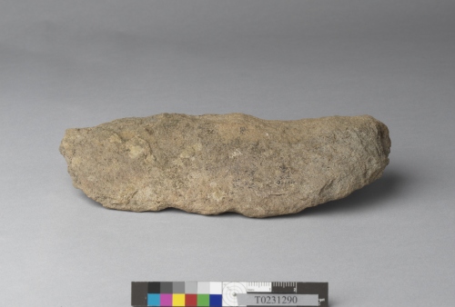 形制:石刀,褐色,由砂岩打製而成,周緣經修整,近橢圓形,上端較厚、下端較薄,正面修整近平。刃部有消耗痕。