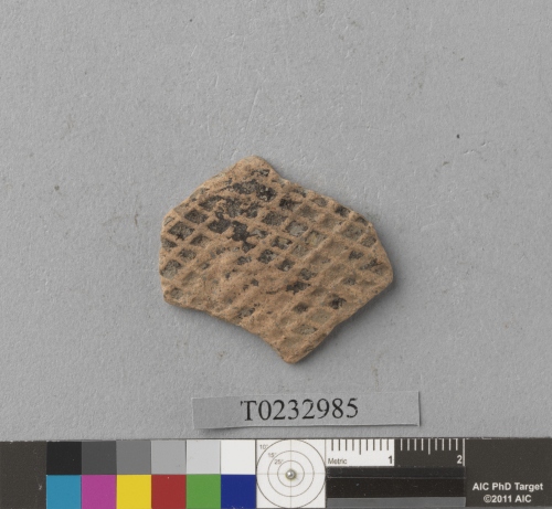 作者不詳(鐵器時代)。[遺物:方格印紋夾砂陶腹片]。《數位典藏與數位學習聯合目錄》。http://catalog.digitalarchives.tw/item/00/85/b2/f4.html(2026/04/17瀏覽)。