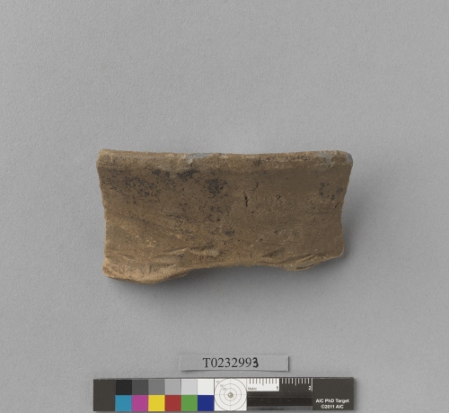 形制:褐色夾砂陶口緣,侈口、唇薄,外側劃一周斜紋、頸折處有一周疑似指甲印紋,表面風化。屬新石器時代中期繩紋紅陶文化的遺物。