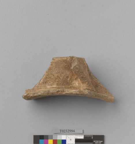 形制:褐色夾砂陶口緣,敞口、束頸,口部外側至肩部處有一斜向的片狀把,把上方殘失,疑為倒「U」字形把,頂部高度超過口緣,素面無紋,表面風化。屬新石器時代晚期丸山文化的遺物,具海岸本地特色。