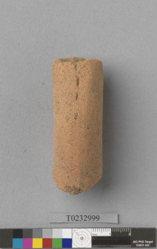 形制:紅褐色夾砂陶把,剖面近圓形,外側有劃虛線紋,表面風化。屬新石器時代晚期丸山文化的遺物,具花蓮特色。