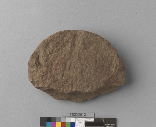 形制:砍砸器,灰褐色,由砂岩打製而成,一面留有原石皮,周緣經修整,近橢圓形,兩端呈圓弧,刃部較薄且有消耗痕。