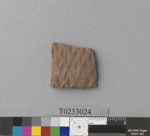 形制:褐色夾砂陶腹片,外側拍印菱格紋,表面風化。屬鐵器時代十三行文化舊社類型的遺物。