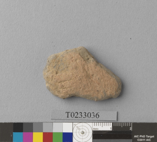 形制:褐色夾砂陶腹片,外側劃不明紋飾,表面風化嚴重。屬新石器時代晚期丸山文化的遺物。