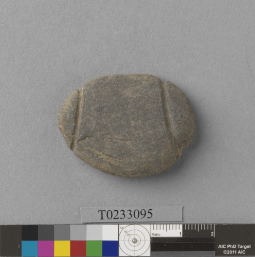 形制:網墜,灰色,由砂岩卵石製成,近橢圓形,器表光滑,兩端分別修出一周凹槽。