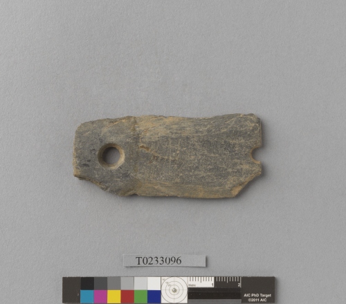 形制:石刀,灰色,雙面修磨平整、上下兩側開刃,左右側分別以雙面穿孔、右側孔較小且殘。左右兩端殘失。