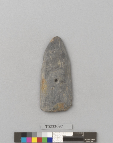 形制:石矛,黑色,由板岩磨製而成,近三角形,兩側磨出刃面,中央有一雙面鑽的穿孔。