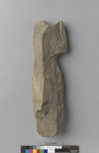 形制:不明石器,灰褐色,由砂岩製成,修整呈近7字形,背面近平整,正面有一道凸稜,稜的外側面經磨製。