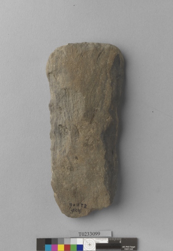 形制:石鋤,灰褐色,由砂岩打製而成,周緣經修整,近長方形,正面圓鼓、背面修整近平,頂部平,刃部較薄。刃部有消耗痕、局部殘失。