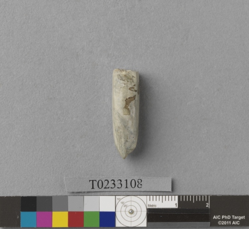 形制:玉鑿,呈四方體,尖端由兩側向內下收呈三角形,通體經磨製。頂部及刃部局部殘失。