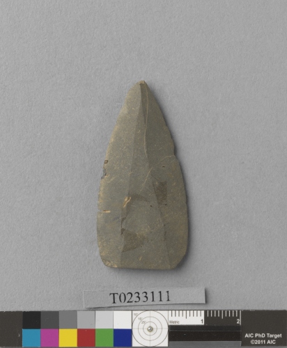 形制:石鏃,淺灰色,由板岩製成,周緣經修整,全器經修磨,近三角形。正面兩側修磨出刃,中央平坦。背面近中央處有一條稜線。