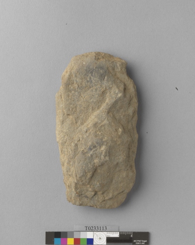 形制:石鋤,褐色,由砂岩打製而成,周緣經修整,近長方形,正面圓鼓、背面修整近平,頂部平,刃部平、正面有縱向磨錯痕,刃部有消耗痕。